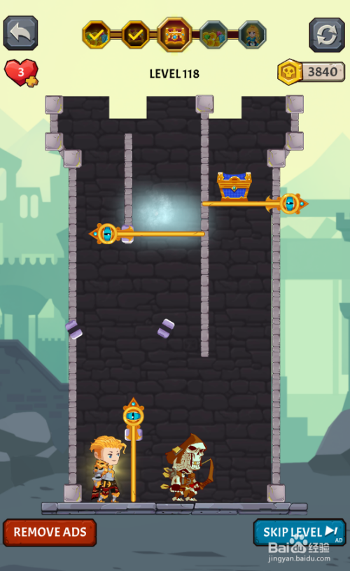 这个关卡的使命是得到宝箱,骷髅兵站在少年右侧,内里有五个插销,环境如图。