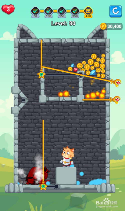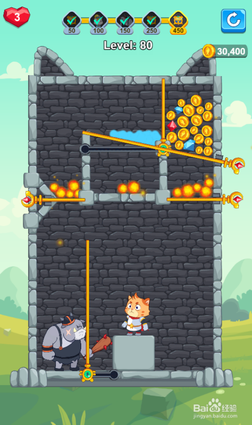 这一关的使命是得到宝藏,恶犬在勇士左侧,水在宝藏左侧,内里有三个插销和两个推拉杆,环境如图。