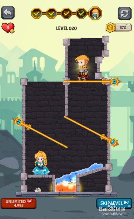 这一关的使命是营救公本家儿,水在公本家儿的上侧,内里有五个插销,环境如图。
