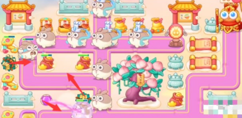 第一波的跑车兔没有之后出没有盾牌的小兔子可以剩下5-6只给最后的炮塔打,我们前边可以将左侧的道具全拓荒。