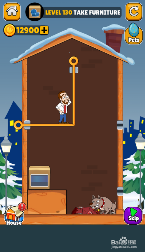 这一关有四个插销,恶魔在家具右侧,恶犬在男本家儿人右侧,使命是得到家具,环境如图。