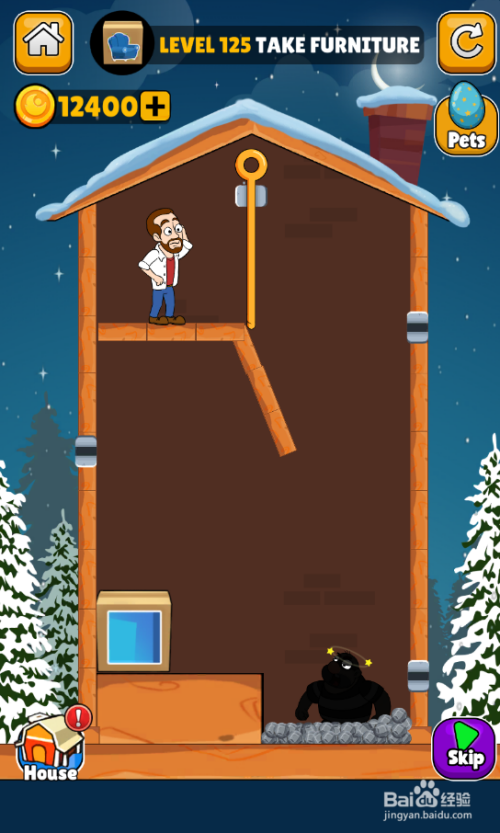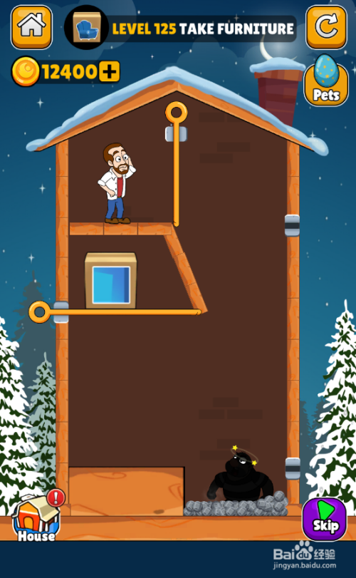 这一关有四个插销,匪徒站在水上侧,熔岩在男本家儿人右侧,使命是得到家具,环境如图。