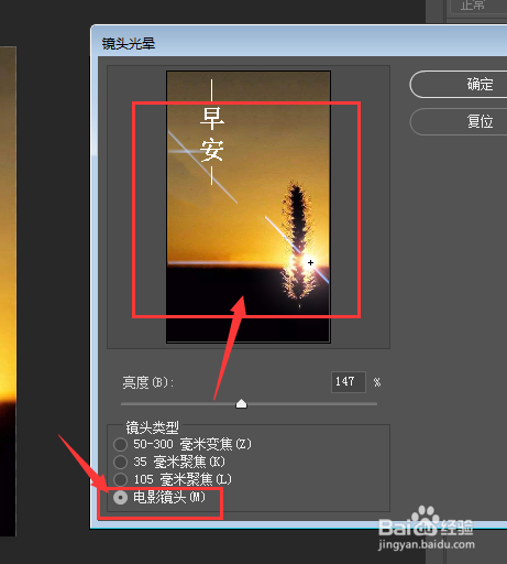 在进入到镜头光晕效果后,有四种镜头类型,按照差别的场景设置差别的光晕,在上面显示图片区域,可以自由移动镜头光的位置
