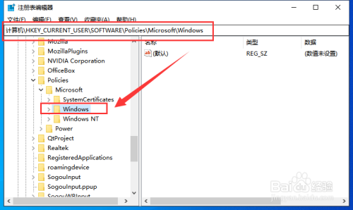 打开当地注册表编纂器,定位到“计较机\HKEY_CURRENT_USER\Software\Policies\Microsoft\Windows”。