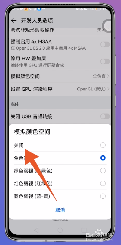跳转到开发职员选项的页面后,标的目的下滑动屏幕,点击模拟颜色空间。
