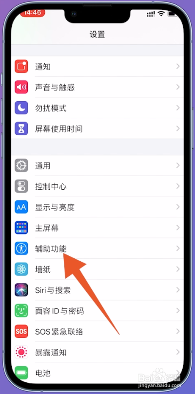 在苹果手机的设置页面,找到页面中的辅助功效,点击它。