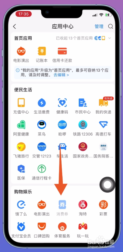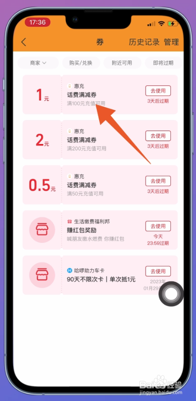 打开应用中间页面之后,点击页面下方的【消用度券】。