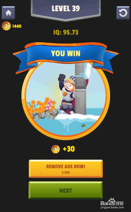 少年景功获得宝藏,弹出YOU WIN动画,如图。这样就过关了。
