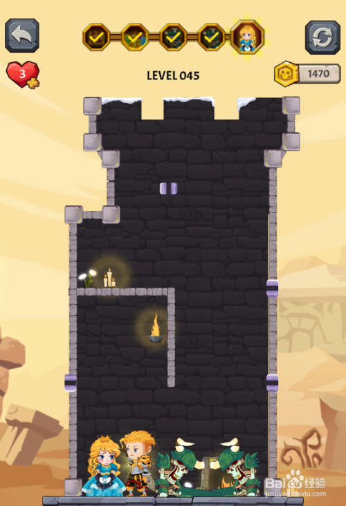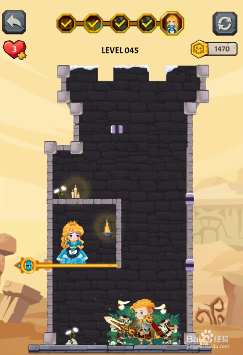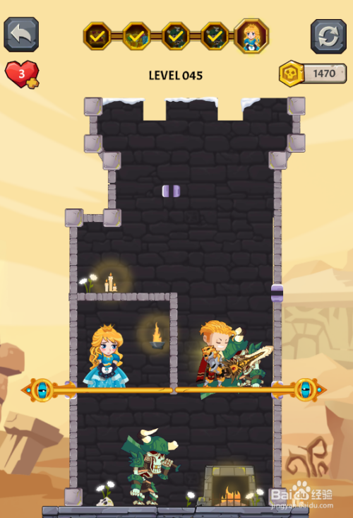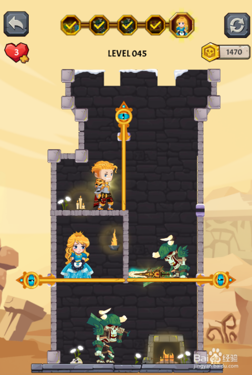 这个关卡的使命是营救被困的公本家儿,宝剑在少年右侧,共有四个插销,环境如图。
