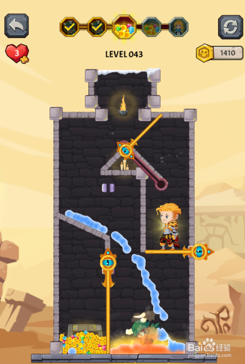 这一关的使命是得到底部的宝藏,熔岩在宝藏上侧,持刀仇敌在宝藏右侧,环境如图。