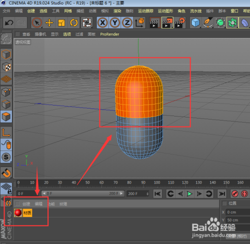将上半部门给全数选中后,就可以添加材质了,新建一个红色的材质,然后添加到胶囊身上,如图所示,这样就给胶囊添加上了一半的颜色