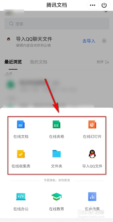 第七步,点击方框中需要新建或添加的选项,即可进入对应的新建或添加在线文档。