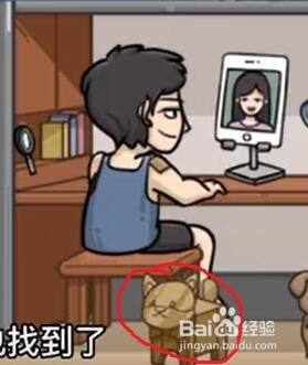 利用放大镜看寸头男生的手机,找到“心情包修狗”。