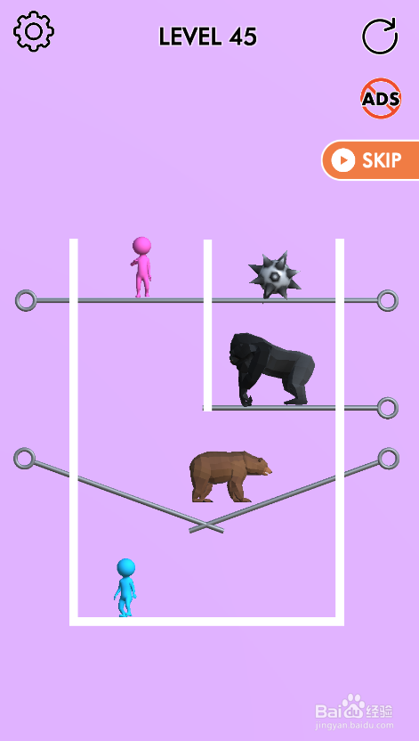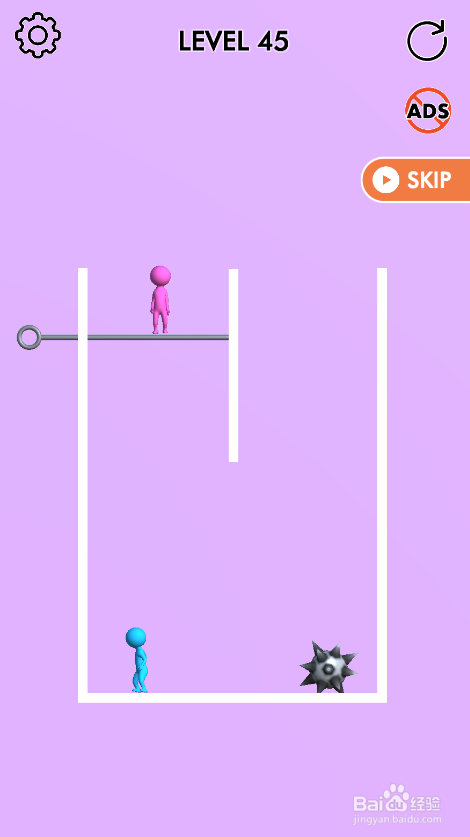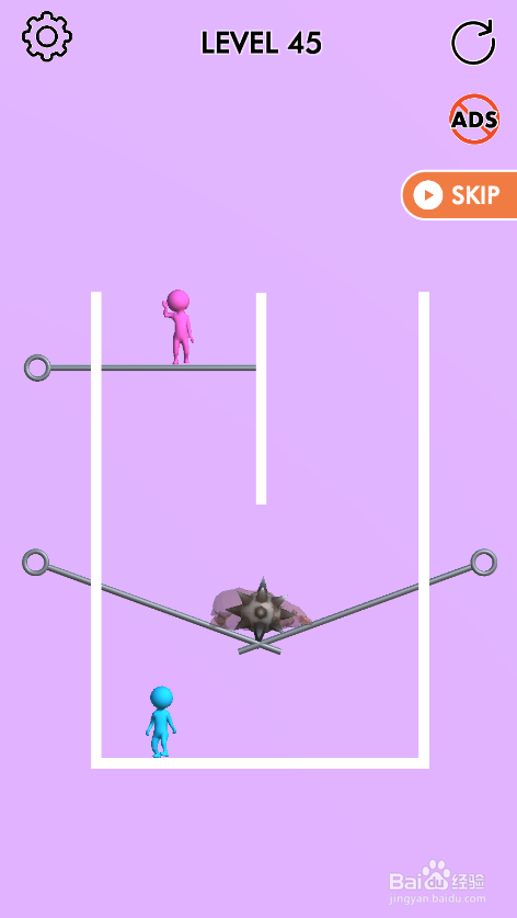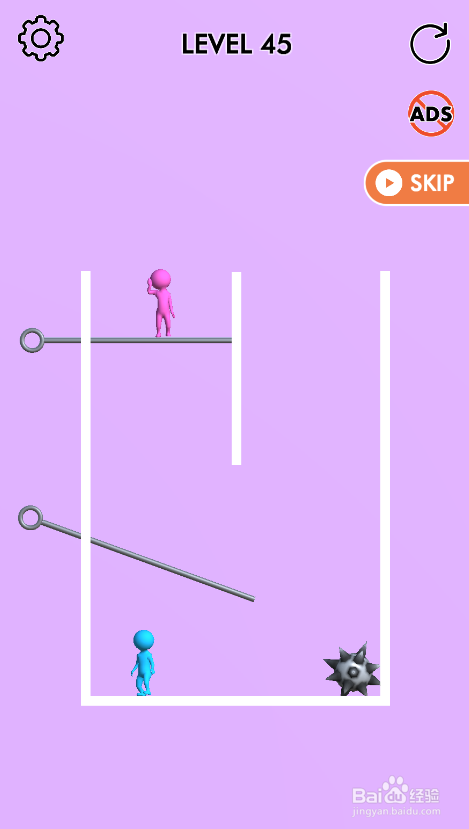 这个关卡内里的蓝色人站在左侧底部,粉色人站在左侧顶部,内里有六个拉针,环境如图。