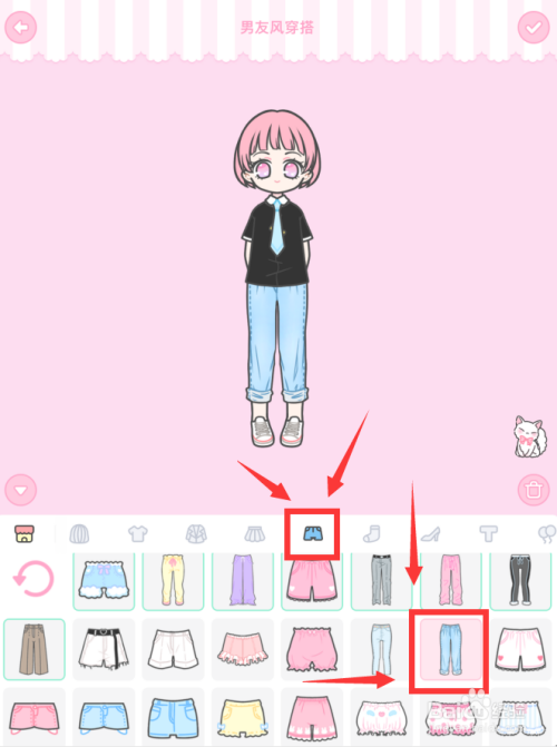点开短裤选项卡,点击第2排倒数第2个粉色长裤,点击右上角的勾勾。