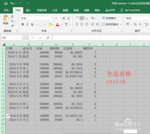 键盘按下CTRL加A,即可全选整个表格。