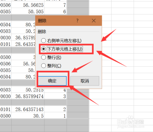 跳出提醒,选择下地契元格上移,选择确定。