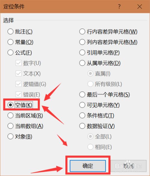 细心不雅察界面,点击空值,点击底部第1个确定图标。