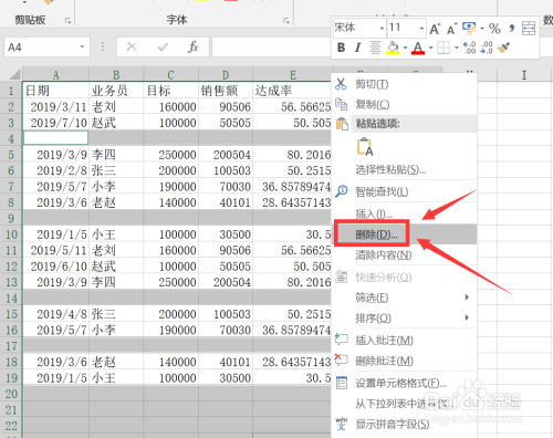 此时表格中的空行即当选定,光标放在上面右击,选择删除。
