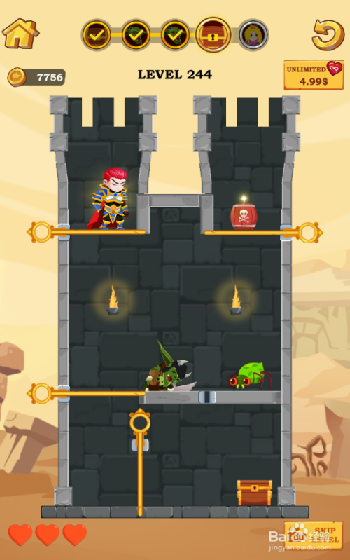 这一关通关使命是得到宝箱,仇敌站在小英雄下侧,毒蜘蛛在宝箱上侧,环境如图。