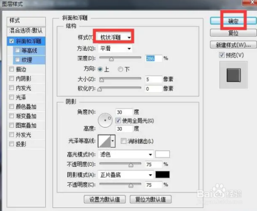 在图层样式窗口中,单击选择枕状浮雕,设置好参数,按确定;