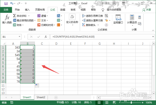 然后选中Sheet1中第一个数字后面的单位格,点击公式,点击主动乞降边上的下拉箭头。