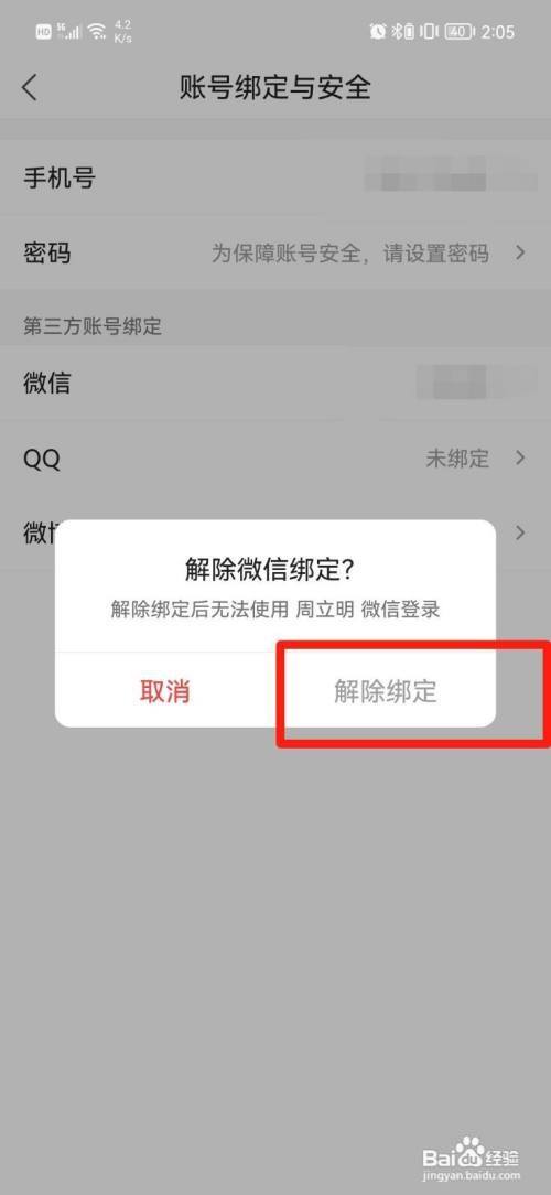 如图所示。本身在弹出的账号绑定与安全页面,点击【排除绑定】,这样就解绑微旌旗灯号了。