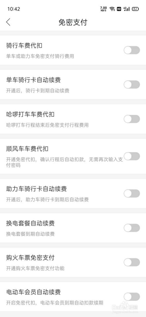 在免密支付界面,点击单车骑行卡主动续用度右侧开关。
