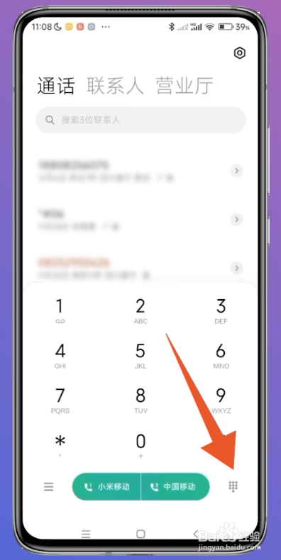 打开德律风页面后,点击拨号键盘左下方的下拉图标。