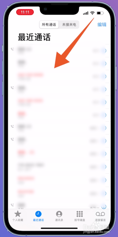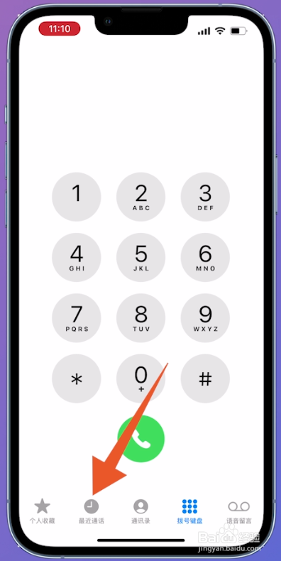 进入苹果酱川手机德律风页面后,点击页面下方的【比来通话】。