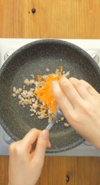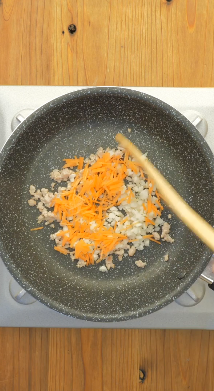 第二步,锅中插手适量橄榄油,先倒入猪肉片翻炒,再插手切碎的花菜,胡萝卜翻炒,倒入适量芡汁。