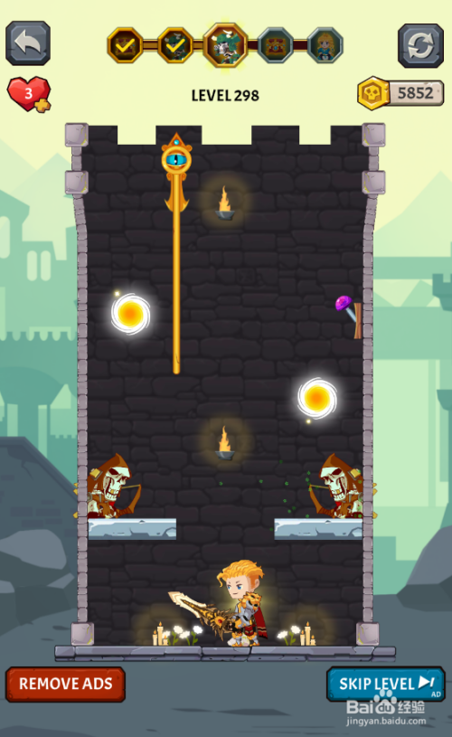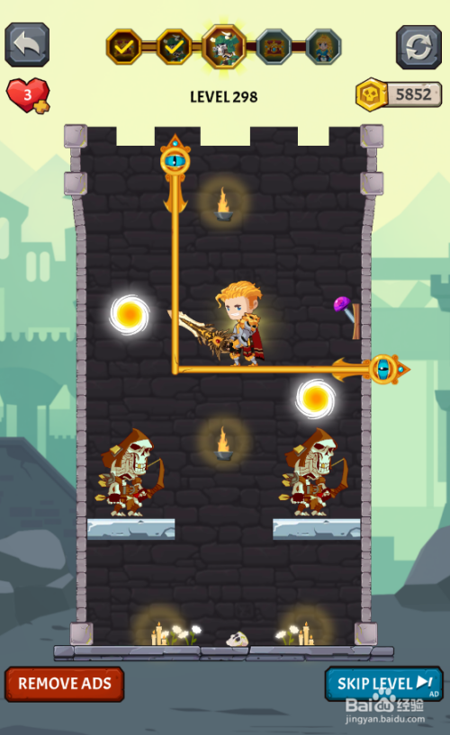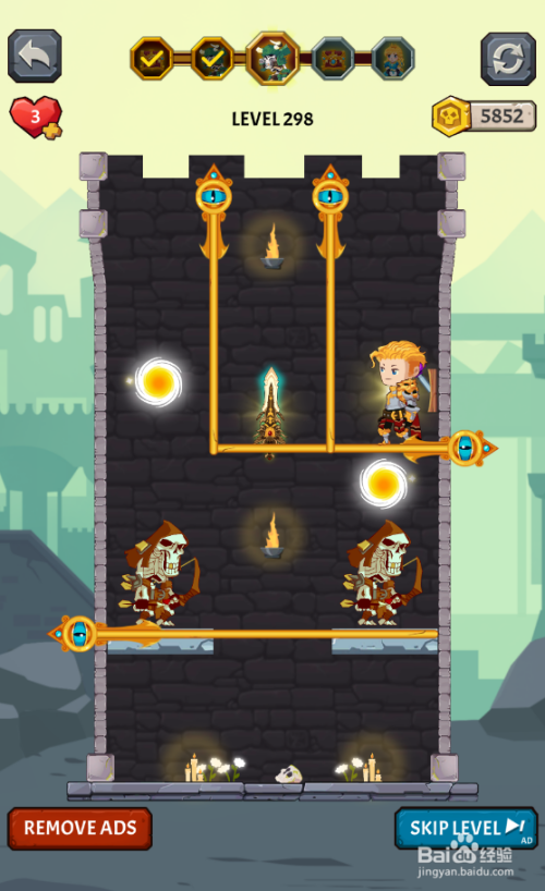 这一关的使命是覆灭骷髅兵,宝剑在少年左侧,紫色开关在少年下侧,内里有五个拉针,环境如图。