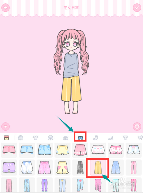 点开短裤选项卡,选择第2排倒数第3个黄色长裤。