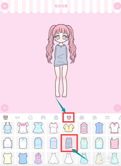 界面切换,点击底部T恤选项卡,选择第2排倒数第4个衣饰。