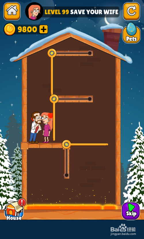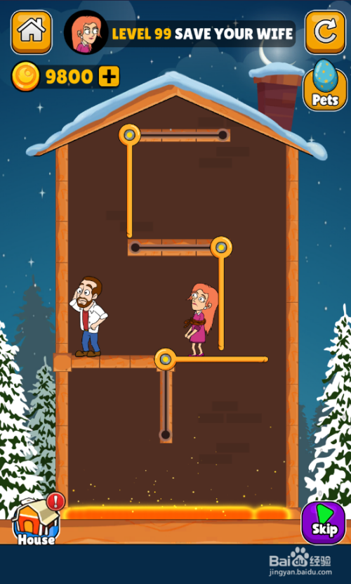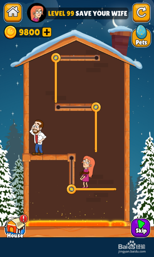 这一关的使命是营救中年大叔的老婆,中年大叔站在上侧石台上,红色熔岩在底部,内里共有三个滑动杆,环境如图。