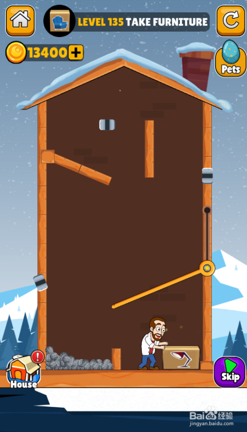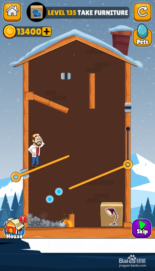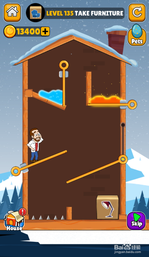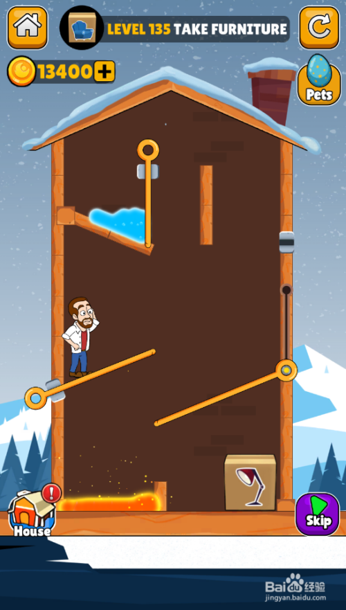 这一关的使命是得到家具,中年大叔站在陷阱上侧,红色熔岩在右侧顶部,内里有三个插销和一个滑动杆,环境如图。