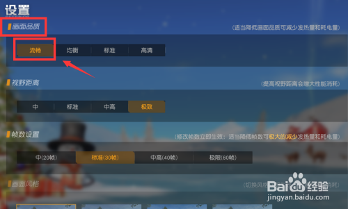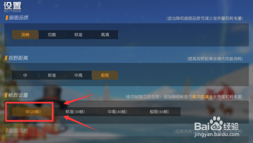 对帧数举行设置,帧数越高越卡顿,将它设为尺度或者是中。