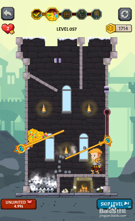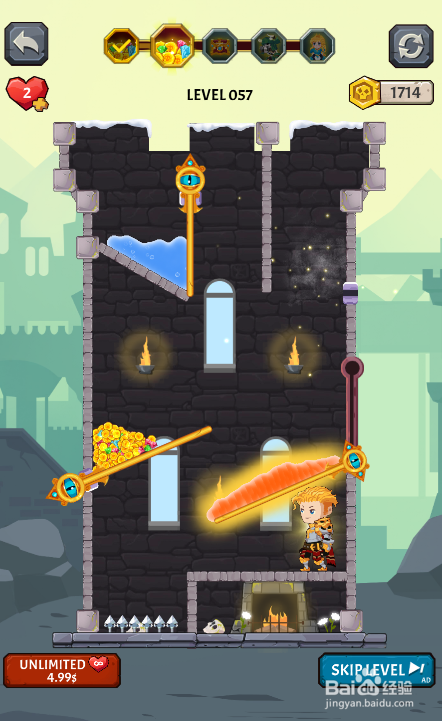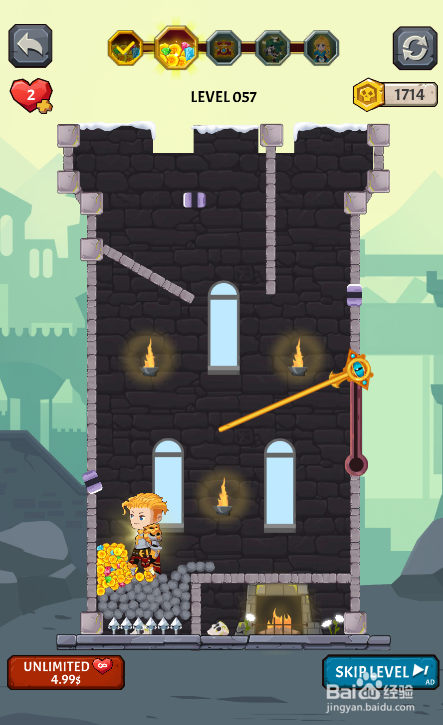 这一关的使命是得到宝藏,陷阱在宝藏下侧,熔岩在金发少年上侧,内里有三个插销和一个推拉杆,环境如图。