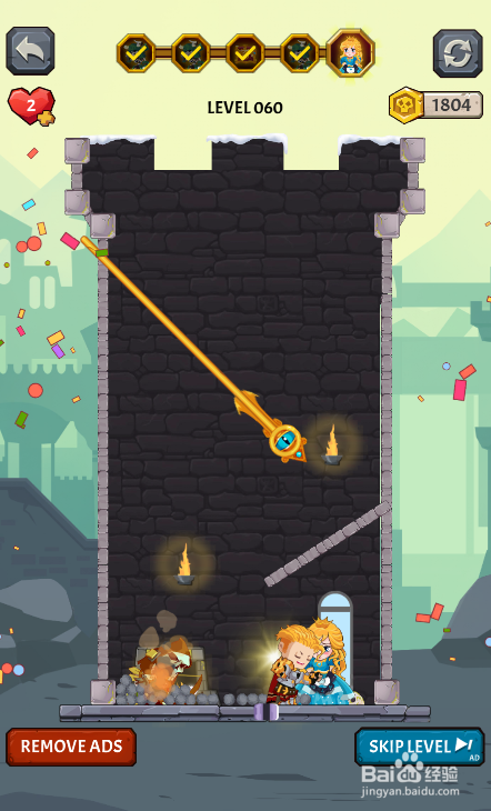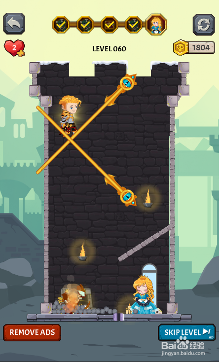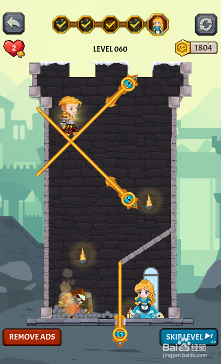 这一关的使命是营救底部的公本家儿,仇敌站在公本家儿左侧,熔岩在金发少年右下侧,内里有五个插销,环境如图。