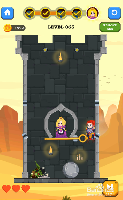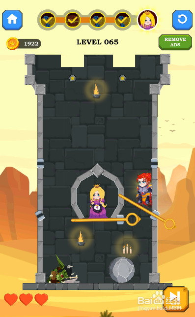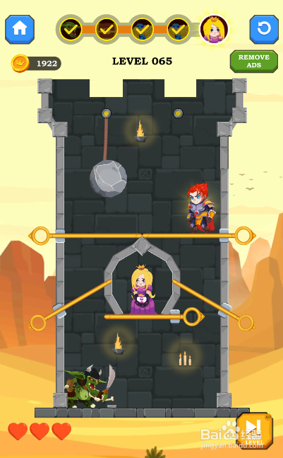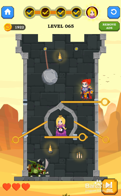 这一关的使命是营救公本家儿,仇敌在底部,巨石被吊在顶部,红发英雄站在巨石右下侧,内里共有五个拉针,环境如图。