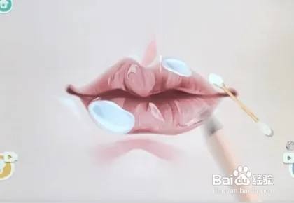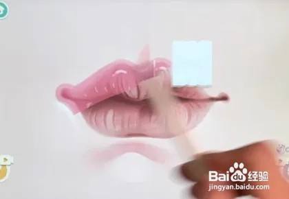 第四步:再利用粉色唇膜涂抹在嘴巴上,棉签涂抹匀称后,用纸巾擦失;