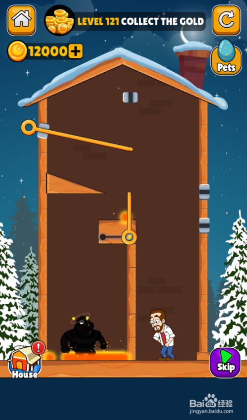 这一关的使命是得到顶部的黄金,熔岩在黄金下侧,匪徒站在左侧底部,内里共有四个插销和一个滑动杆,环境如图。