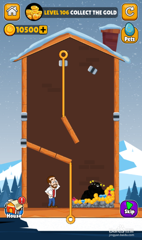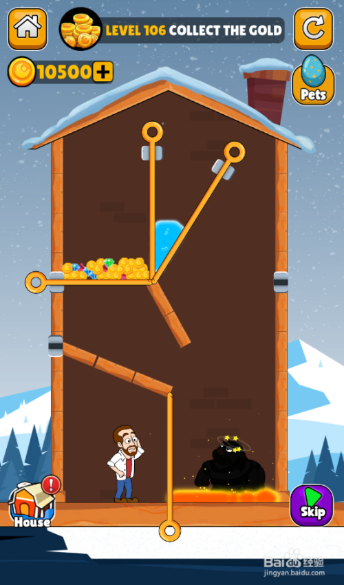 这个关卡的使命是得到黄金,黄金在红色熔岩上侧,中年大叔站在底部左侧,内里共有六个插销,环境如图。