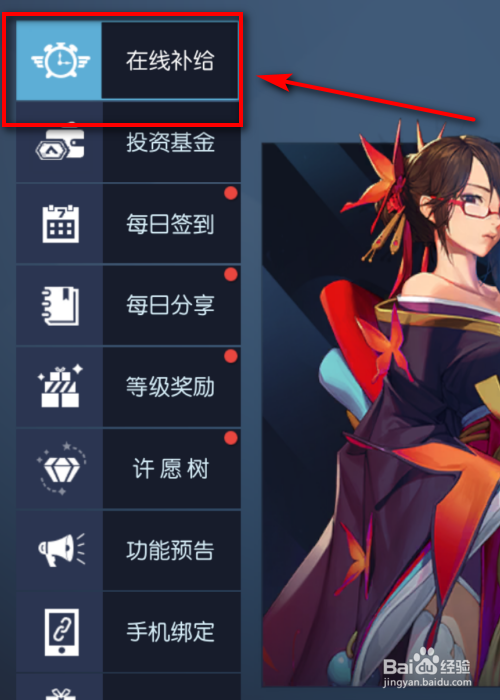 此时,点击左侧栏顶部的在线补给图标。