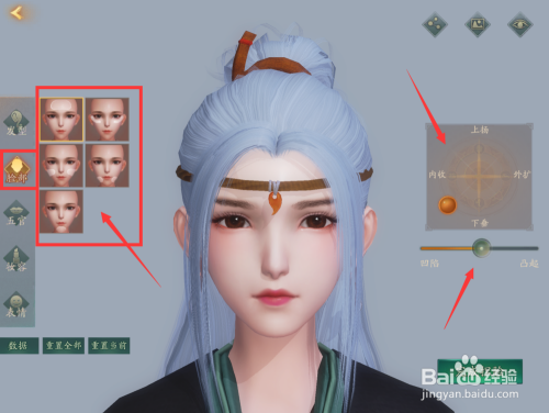 左侧点击五官,选择端倪,点击对应的端倪举行预览。