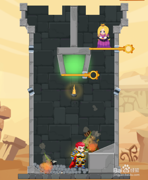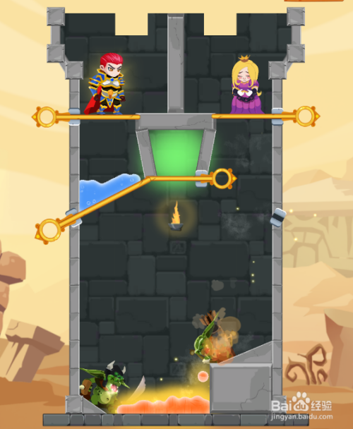 这一关的使命是营救公本家儿,公本家儿被困在右侧顶部,少年站在水的上侧,内里共有五个拉针,环境如图。