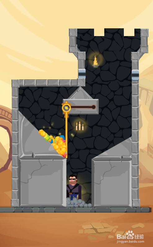 这个关卡的使命是得到宝藏,宝藏在左侧顶部,英雄站在熔岩上侧,内里共有一个推拉杆和两个插销,环境如图。
