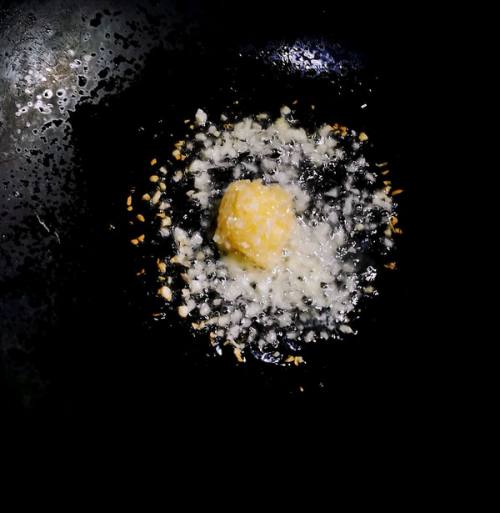 2蒜剁当作蒜泥,锅热后放入适量油,小火放入蒜泥当作淡淡的微黄关火。