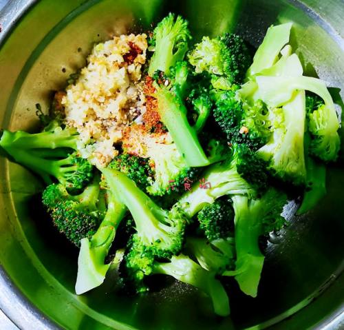 3将西兰花放入碗内,提前放入辣椒细粉,盐,鲜酱油,鸡精,冲入方才烧好的蒜泥和油。
