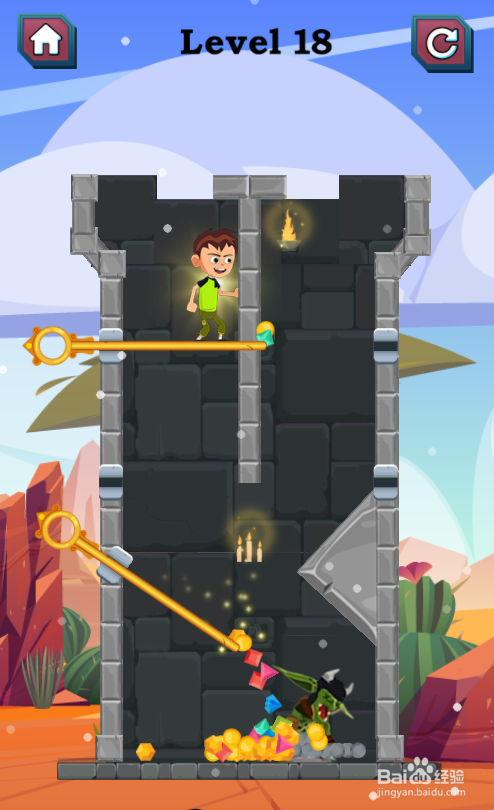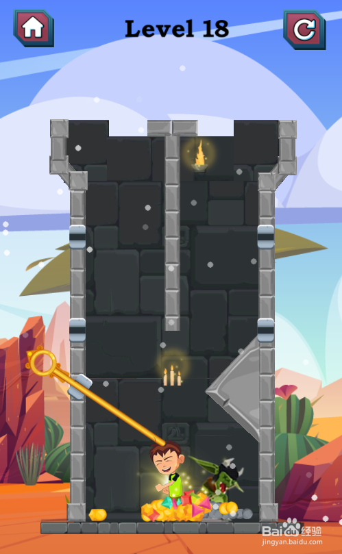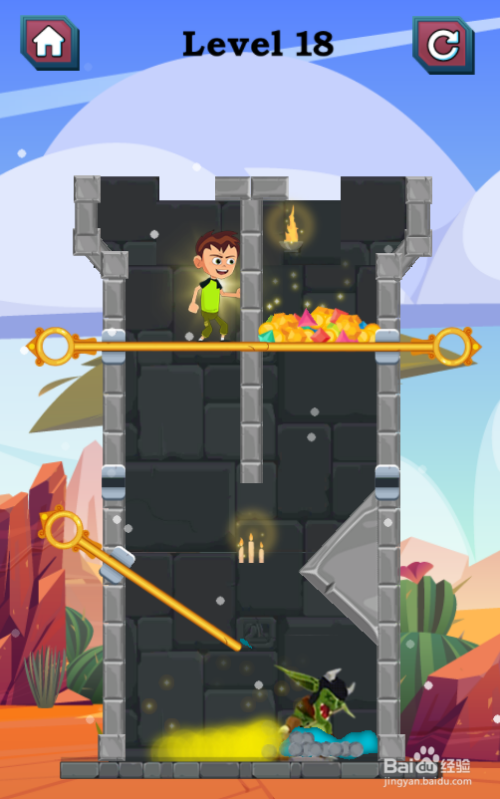 这一关的使命是得到顶部的宝藏,内里共有五个插销,熔岩在宝藏的下侧,环境如图。